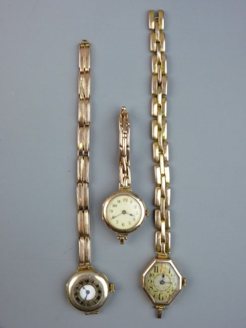 THREE NINE CARAT GOLD LADY'S WRISTWATCHES with expanding straps, one in half hunter style, 76 grms gross