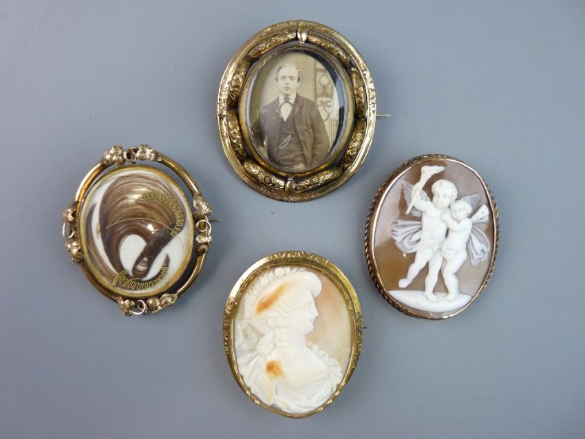 FOUR LARGE VICTORIAN BROOCHES to include a shell carved cameo depicting winged cherubs and one other and two swivel brooches (no visible marks or stamps)
