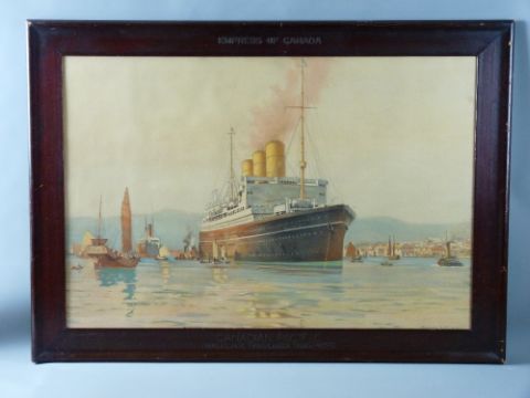 NORMAN WILKINSON coloured print - of the Canadian Pacific 'Empress of Canada' with numerous boats in harbour, 58 x 88 cms