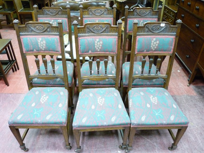 A SET OF SIX EDWARDIAN OAK TALLBACKED DINING CHAIRS, the top rails having garlanded decoration and a padded rail with three carved lower supports, all attractively upholstered and on square tapered supports and porcelain castors