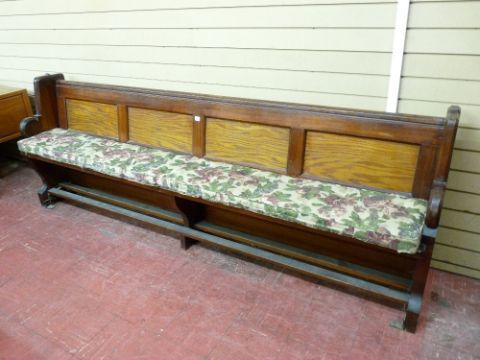 A PITCH PINE CHURCH/SCHOOL PEW having four inset panels to the back and an open slatted base, 248 cms wide