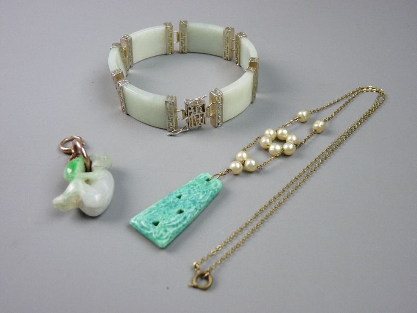 A 925 SILVER & LIGHT GREEN JADE BRACELET of six oblong tablets, 34.5 grms, a jade monkey pendant with gold hanging loops and a jade pendant of tapered form with yellow metal link chain and pearl drops
