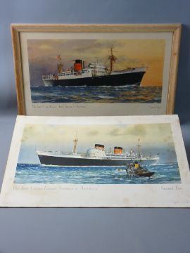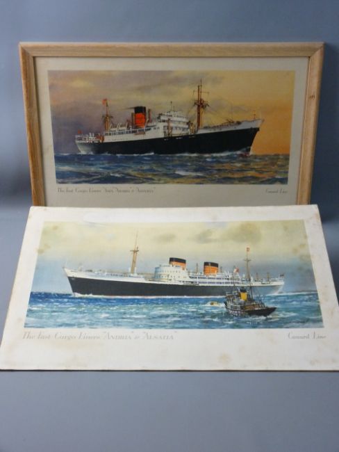 TWO CUNARD WHITE STAR coloured prints - the first entitled 'The Fast Cargo Liners Asia, Arabia and Assyria', framed and the second 'The Fast Cargo Liners Andrea and Alsatia', unframed, each 33 x 55 cms