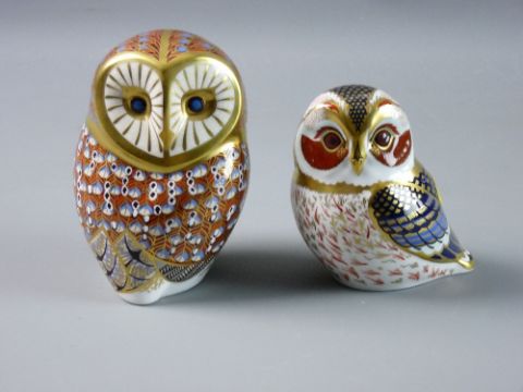 TWO ROYAL CROWN DERBY OWL PAPERWEIGHTS, an 11.5 cms high example marked 'MMI' and factory backstamp to the base, the other 9 cms high marked 'Tawny Owl MMV' 2002 Royal Crown Derby marks to the base
