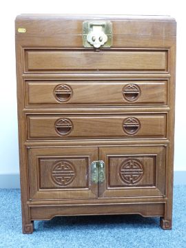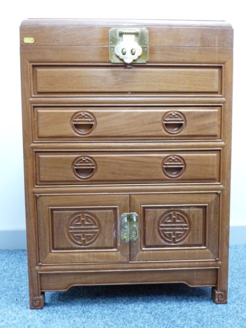 A CHINESE ROSEWOOD CUTLERY CHEST having a lift-up top and two lower drawers, all baize lined with two lower cupboard doors, carved inset handles and roundel decoration, brass clasps and locks, 79 cms high, 56 cms wide, 38 cms deep