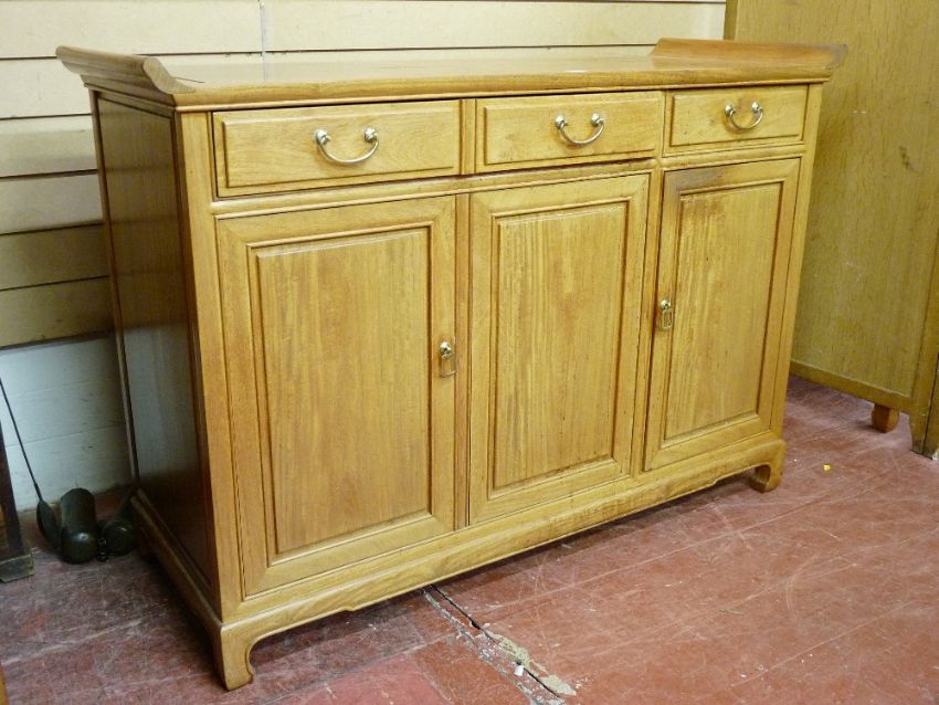 A CHINESE ROSEWOOD SIDEBOARD, the top with curved raised sides over two baize lined frieze drawers and three lower cupboard doors, all with brass circular pommels and swing handles, on a shaped plinth base, 87.5 cms maximum height, 125 cms wide, 46 cms deep