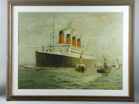 SAM J D BROWN large coloured print - entitled of the 'Cunard Line, Aquitania', 69 x 93 cms (for restoration)