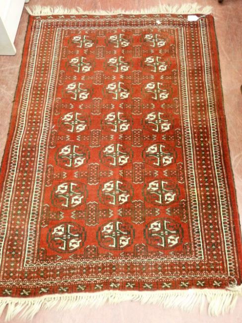 AN EASTERN WOOLLEN BOKHARA CARPET, hand knotted with central repeating pattern and wide multi-border, with tasselled ends, 144 x 101 cms