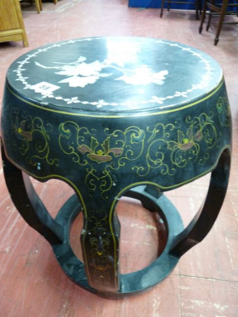 A CHINESE BARREL SHAPED STOOL in black lacquerwork with cloisonne style painted decoration and mother of pearl floral inlaid top, 47.5 cms high