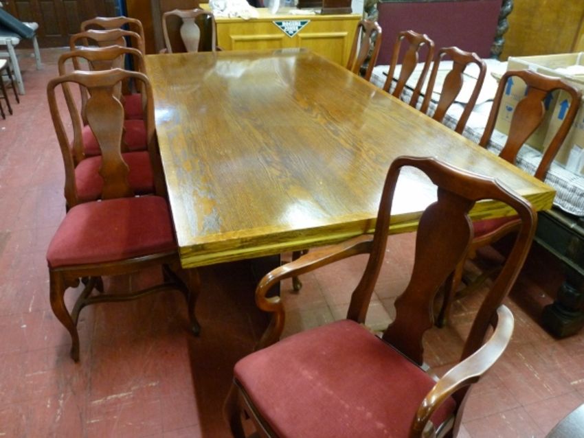 A GOOD QUALITY MID COLOUR POLISHED ONE PIECE DINING TABLE or boardroom table, 8ft x 4ft (240 x 120 cms) on a base of two mirrored glass supports together with ten (eight plus two) good quality reproduction splatback dining chairs