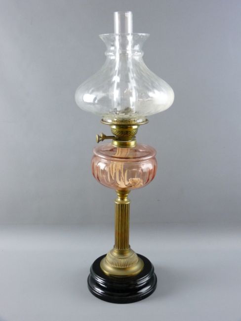 A VICTORIAN OIL LAMP with pink glass facet cut font on a classically styled brass column stand and circular pot base, the brass wick holder with conical adjusters topped with a clear glass shade and funnel, 69 cms overall height