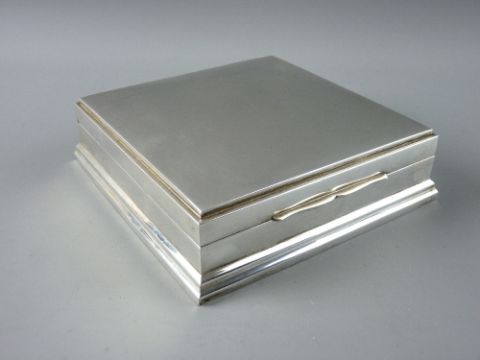 A 925 STERLING SILVER SQUARE TRINKET BOX having an attractive burr walnut lined interior, 13 cms square