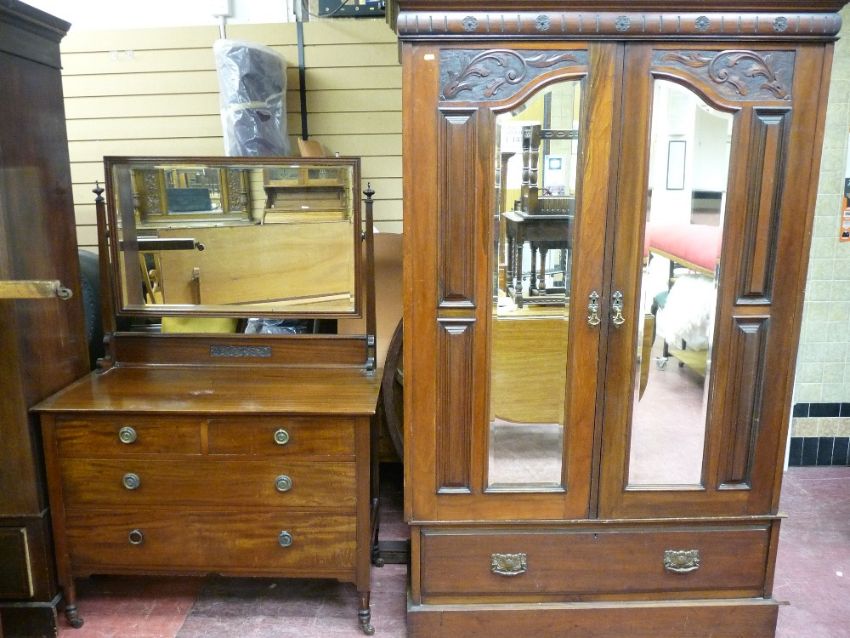 AN EDWARDIAN CARVED MAHOGANY WARDROBE & NON-MATCHING DRESSING TABLE having carved top panel doors and shaped bevelled edge mirrors over a base drawer on a plinth base, 199 cms high, 122 cms maximum wide, the dressing table with tapered mirrored supports and finial caps over a two short and two long drawer base, on brown pot castors, 106.5 cms wide