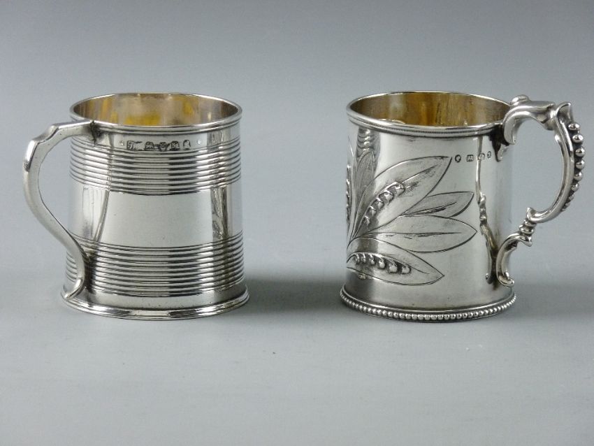 A SMALL SILVER MUG with twin strapwork banding and, possibly Jewish inscription, 3.2 troy ozs, London 1807 by Thomas Whipman and a small Victorian silver mug with 'Lily of the Valley' decoration, 2.2 troy ozs, Birmingham 1872