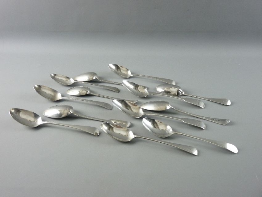 A PARCEL OF SIX PAIRS OF GEORGIAN SILVER SERVING SPOONS and a single serving spoon, 25 troy ozs total