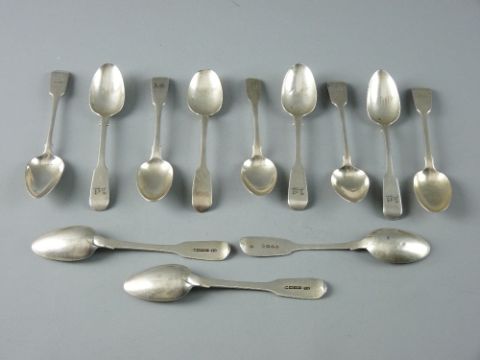 A PARCEL OF SILVER FIDDLE PATTERNED TEASPOONS - five London 1868, 3.7 troy ozs, the remaining seven mixed, 4.7 troy ozs