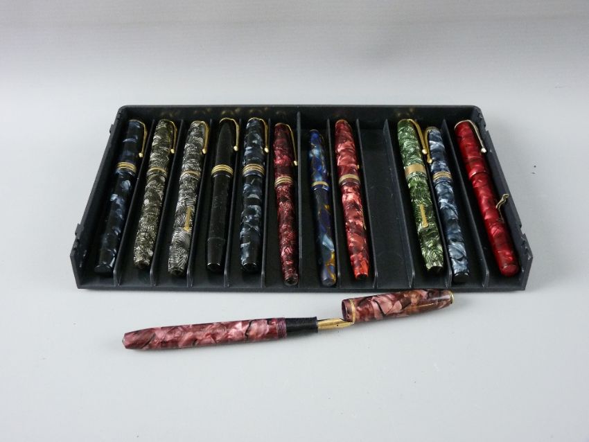 TWELVE CONWAY STEWART FOUNTAIN PENS with fourteen carat gold nibs including a 55, two 28s, two 58s, one 73, one 12, one 85L, one 85, one 27, one 388 and a Richmond for WHSmith, Surrey with CS clip, all in marble finishes save one 58