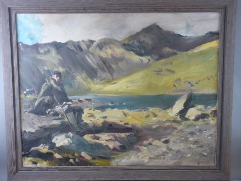 HOWARD MORGAN (1949 -) oil on canvas - powerful landscape of Llyn Llydaw and Snowdon with seated shepherd and stick resting on a rock, signed and dated 1988, 70 x 90 cms Auctioneer's note: the artist is a notable painter of commissioned and Royalty portraits in particular of her Majesty the Queen (see page 1130 of 'Artists in Britain since 1945' by David Buckman)