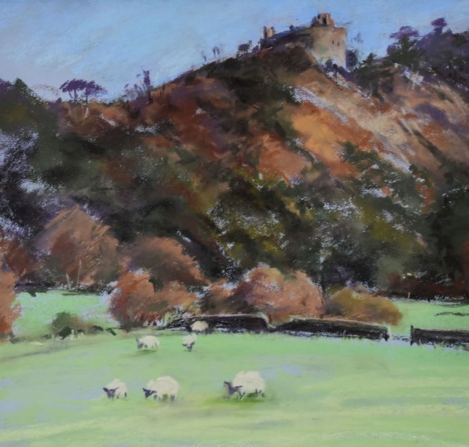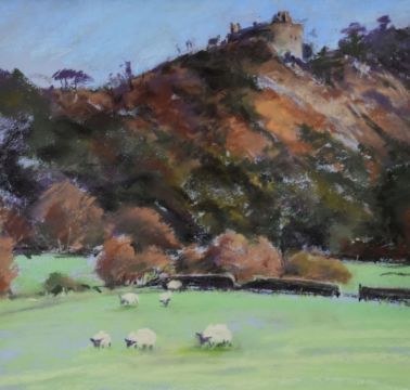 ANN WHALLEY pastel - landscape with sheep, entitled verso on Fountain Gallery, Llandeilo label, 'Dinefwr Castle', 28 x 29cms