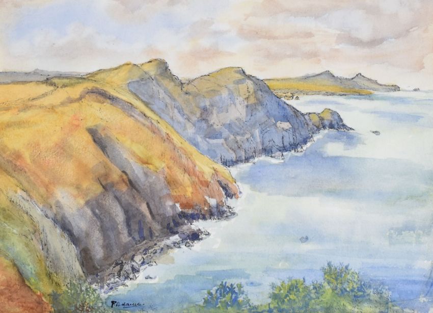 P ADAMS watercolour - Pembrokeshire coastal scene entitled 'Pwllderi', signed, 28 x 38cms Provenance: commissioned by vendor in 1977