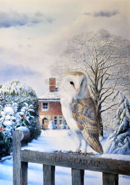 COLIN WOOLF coloured limited edition (50/100) print - study of a barn owl on the old vicarage gate after snow, signed in full, 45 x 32cms