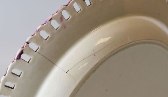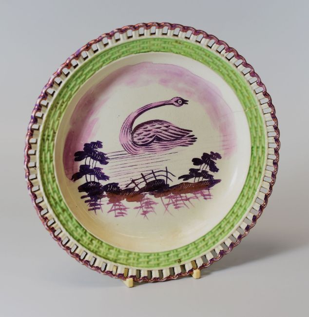 A DILLWYN SWANSEA POTTERY PLATE WITH ARCADED BORDER circa 1815-20 with lustre rim, green glazed basket-weave border and the interior having a pink lustre depiction of a swan and river scene, horseshoe impressed DILLWYN & CO SWANSEA, 20cms diam Provenance: private collection directly from up-state New York Welsh descendants