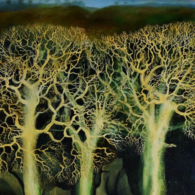 SARA PHILPOTT oil on board - landscape with trees entitled verso 'Three Winter Trees', signed verso and dated 2011, 30 x 30cms
