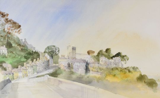 SIMON L JONES watercolour - view of Llandeilo town from the Towy Bridge, signed and dated '86, 36 x 89cms