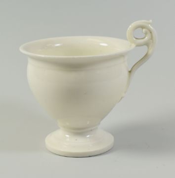 A SWANSEA PORCELAIN UNDECORATED CABINET CUP of urn shape with scrolling spurred handle, 9cms diam