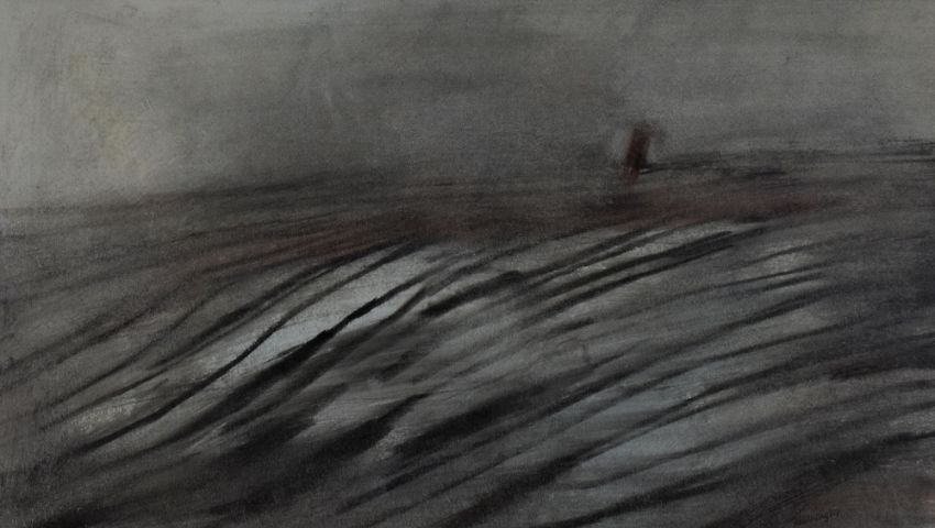 JOHN WRIGHT mixed media - entitled verso on Howard Roberts Gallery label 'The Cloudy Acres', signed, 29.5 x 51.5cms