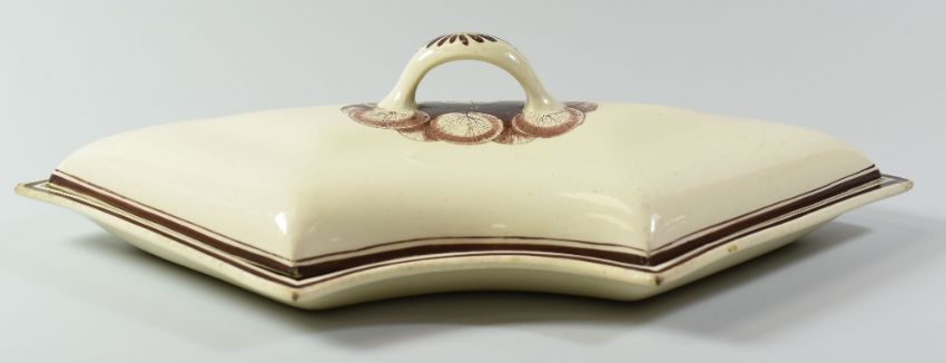 A SWANSEA CREAMWARE SUPPER-SET PART circa 1805, of curved form with loop handle and with painted fruit and borders in chocolate enamel, impressed arrow mark to base, 30cms wide