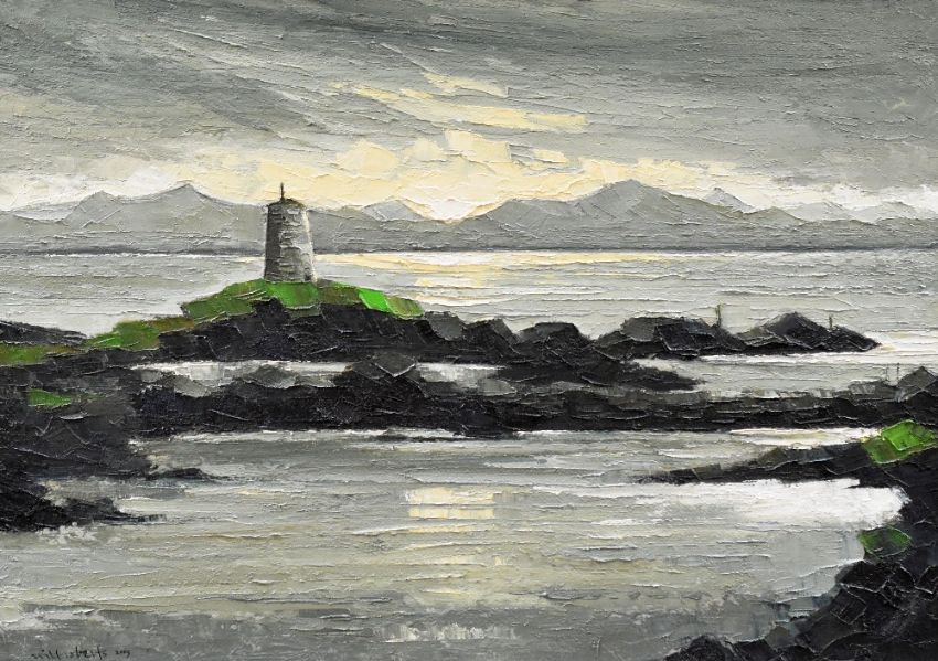 WILF ROBERTS oil on canvas - panoramic view of Caernarfon Bay and The Rivals Mountain Range from the rocky shore of Llanddwyn Island off the Anglesey coast with the navigation beacon in the foreground, signed and dated 2005, 56 x 81cms Provenance: 2005 purchase receipt - Attic Gallery, Swansea