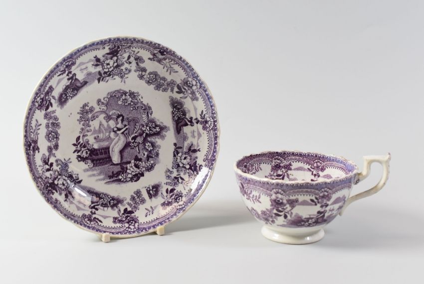 A SWANSEA CAMBRIAN POTTERY CUP & SAUCER circa 1824-1831 in the puce 'Ne Plus Ultra' pattern with panels featuring ladies in leisure within elaborate floral borders