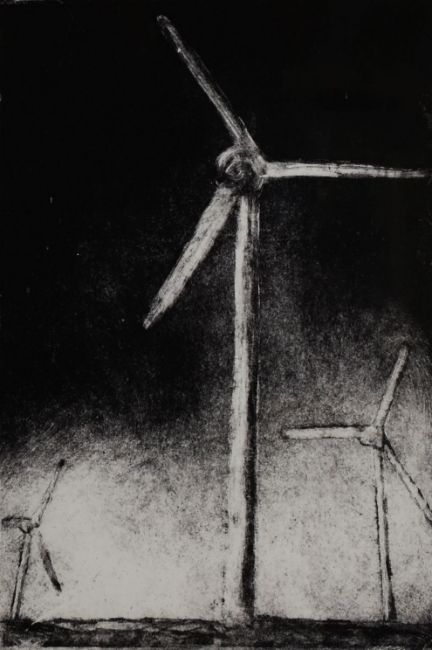 EIRIAN LLWYD (1957-2014) limited edition (3/10) etching - three wind turbines, entitled 'Melinau Gwynt' / 'Windmills', signed and dated 2002, 33 x 23cms