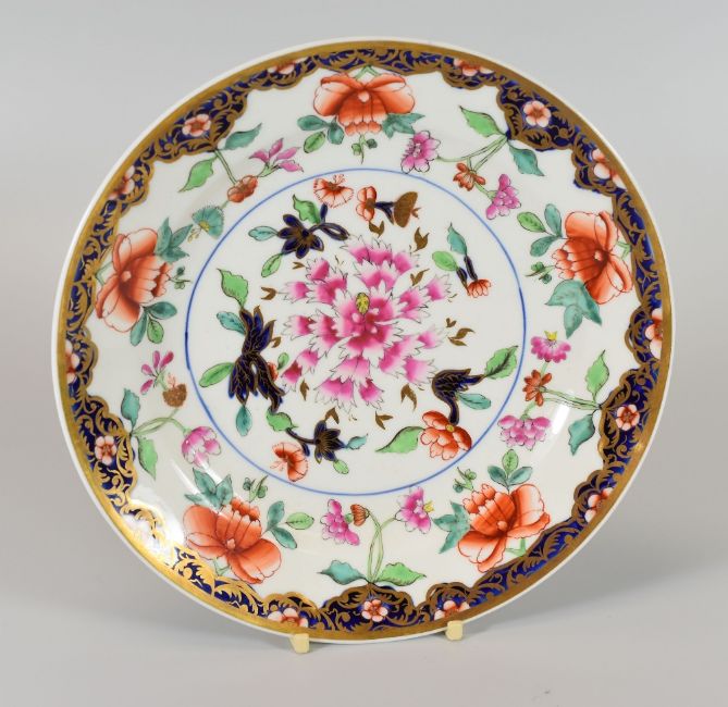 A SWANSEA PORCELAIN ORIENTAL STYLE PLATE circa 1818, with border of gilt foliage and pink flowers on underglazed cobalt-blue ground and surrounded by stylised honeysuckles in a white reserve, the interior with a blue ring containing a large centre pink open flower with surrounding foliage, red Swansea script mark with pattern number 223, 21cms diam Provenance: private collection directly from up-state New York Welsh descendants