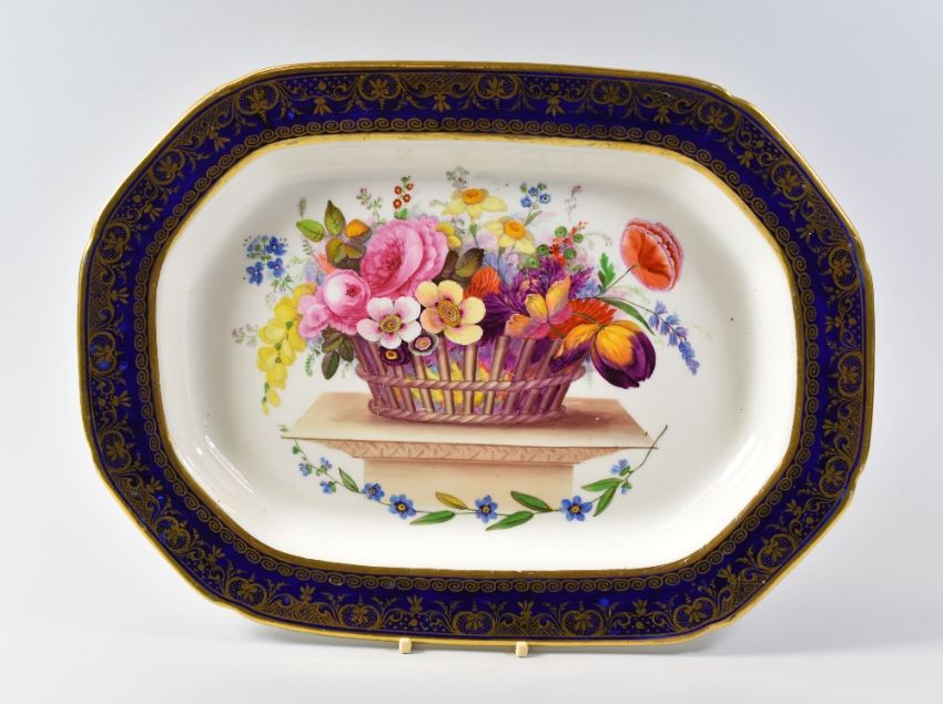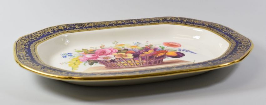 A SWANSEA PORCELAIN PLATTER FROM THE LYSAGHT SERVICE of canted rectangular form, the decoration attributed to Henry Morris with a large extravagant bouquet of flowers contained within a basket upon a plinth above a chain of flowers, the border decorated with elaborate continuous gilding to a gros-bleu reserve, unmarked, 36cms wide Provenance: by bequest to a Vale of Glamorgan gentleman