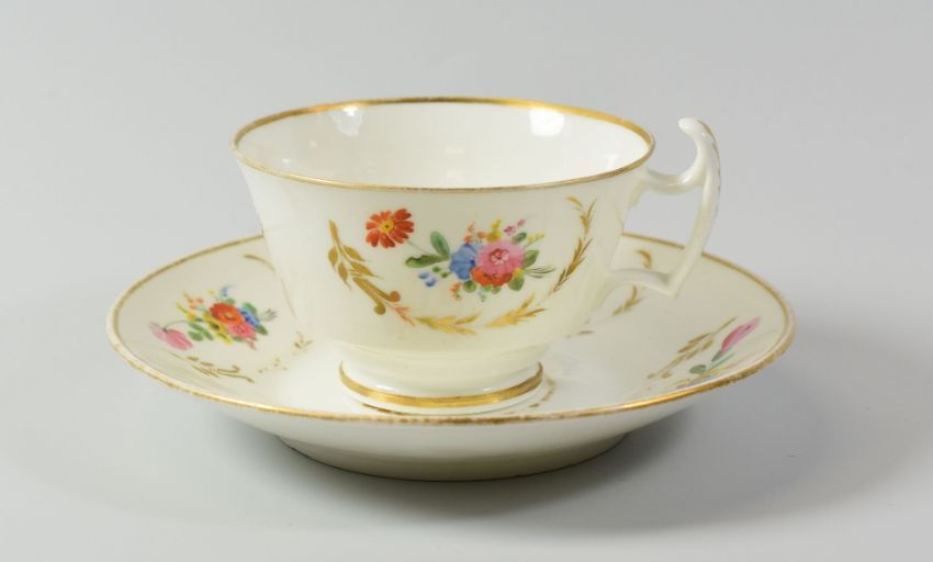A SWANSEA PORCELAIN CUP & SAUCER with floral sprays and gilding, black Swansea script mark (wear)