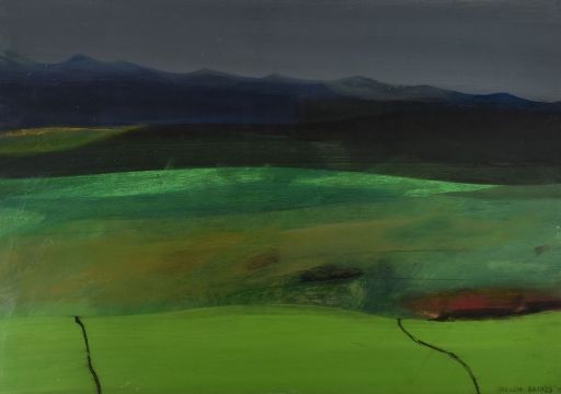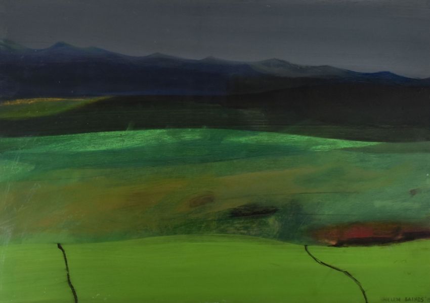 HELEN BAINES mixed media on board - landscape with mountain range, entitled verso 'Cwm Ystrad Llyn II', signed and dated 2015, 40 x 58cms