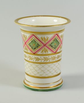 A SWANSEA PORCELAIN SPILL VASE with flared rim and with ridged and footed base, the body decorated with bands of floral, geometric and seeded tiling in gold, pink and green, 8.5cms high, red stencilled SWANSEA mark to base Auctioneer's note: a fine example of Swansea porcelain with an evenly translucent quality