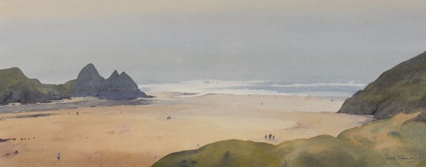GARETH THOMAS watercolour - Gower peninsula coastal scene with figures, entitled verso 'Above Three Cliffs Bay', signed, 22 x 54cms
