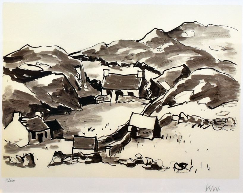 SIR KYFFIN WILLIAMS RA colour wash limited edition (18/350) print - Caernarfonshire hillside cottages, signed with initials, 40 x 50cms
