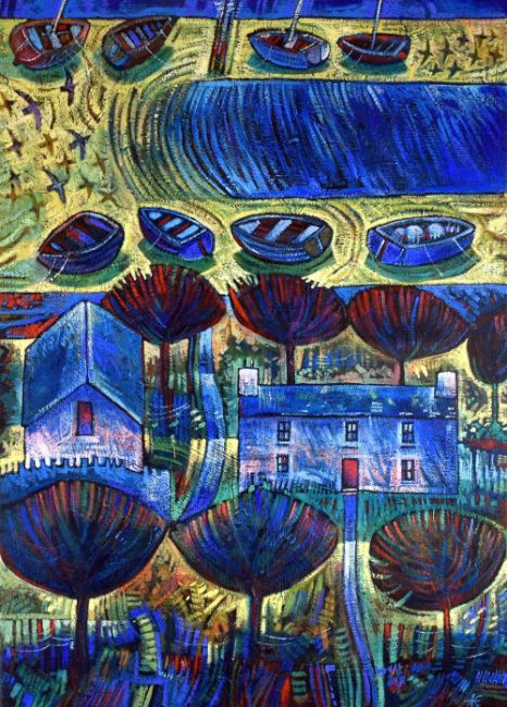 ANTHONY EVANS acrylic on board - rows of trees and houses, entitled verso 'Cylfach and Cove', signed with initials, 55 x 40cms