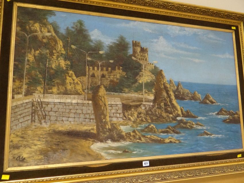 Framed oil on canvas - dramatic coastal scene with Moorish castle