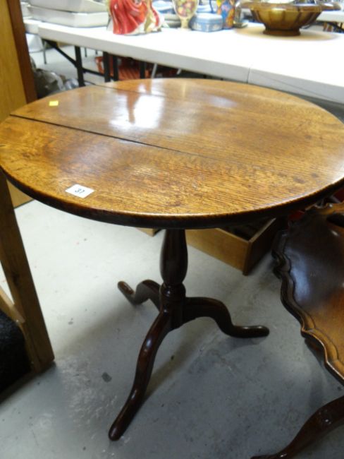 An antique oak tilt-top tripod occasional table