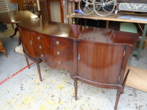 A regency-style dining suite comprising serpentine standing sideboard, twin pedestal dining table and four chairs