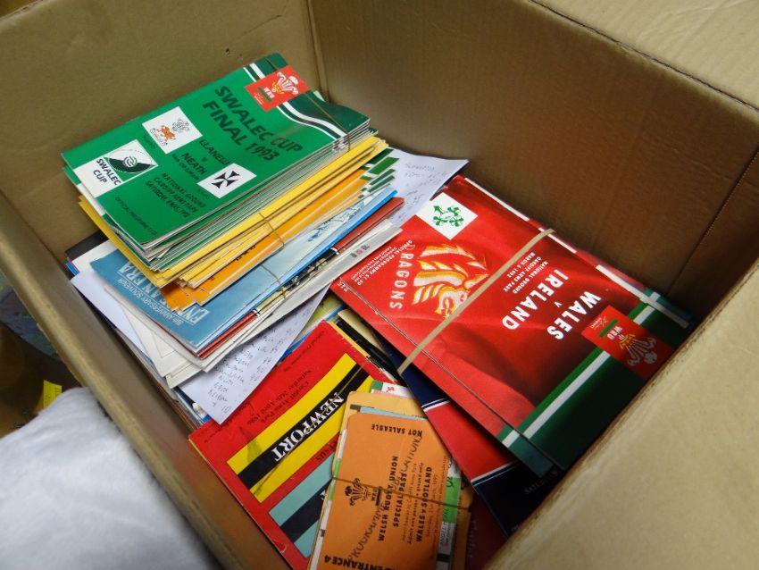 A box of sporting programmes including Cardiff Devils, Welsh rugby, Welsh football etc