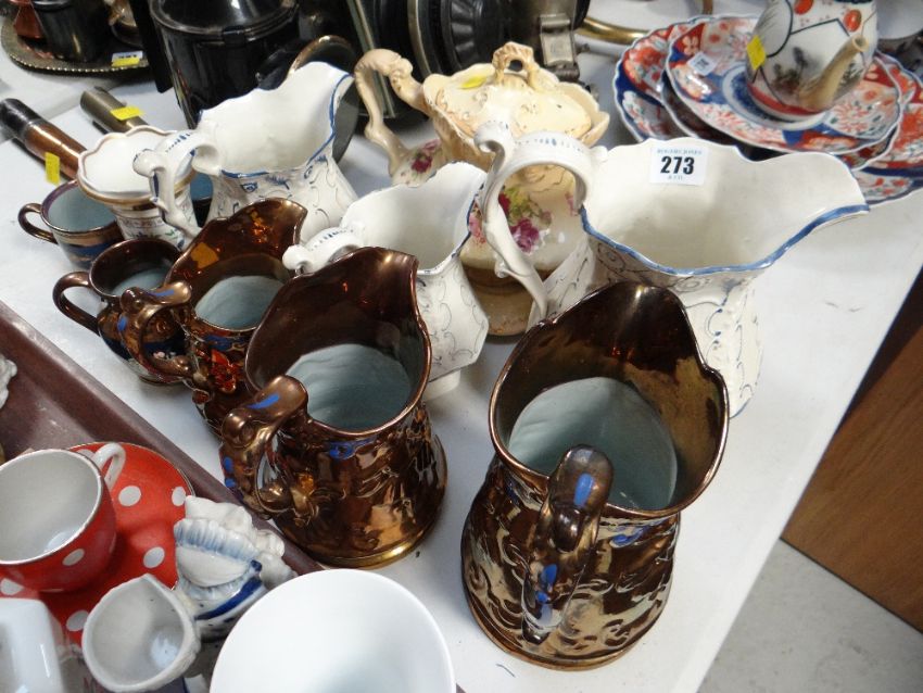 A trio of relief moulded pouch jugs, sundry copper lustre items etc