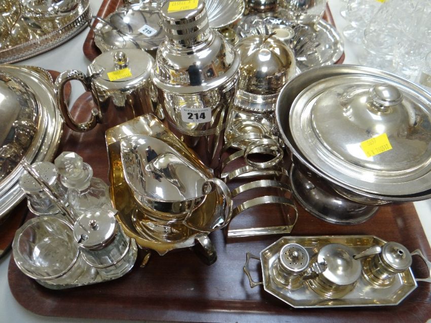 An EPNS cocktail shaker and a quantity of mixed EPNS tableware