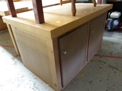 A large workshop workbench with vice together with a lightwood workshop table with drawers