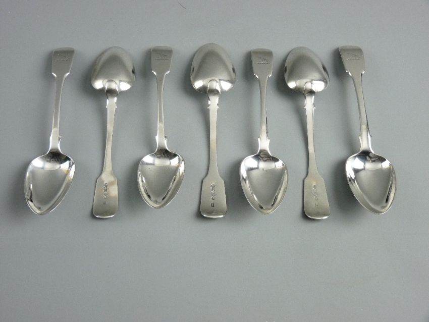 A SET OF FIDDLE PATTERNED SILVER DESSERT SPOONS by William Woodman, Exeter 1823, 8.2 troy ozs, with crests to the handles